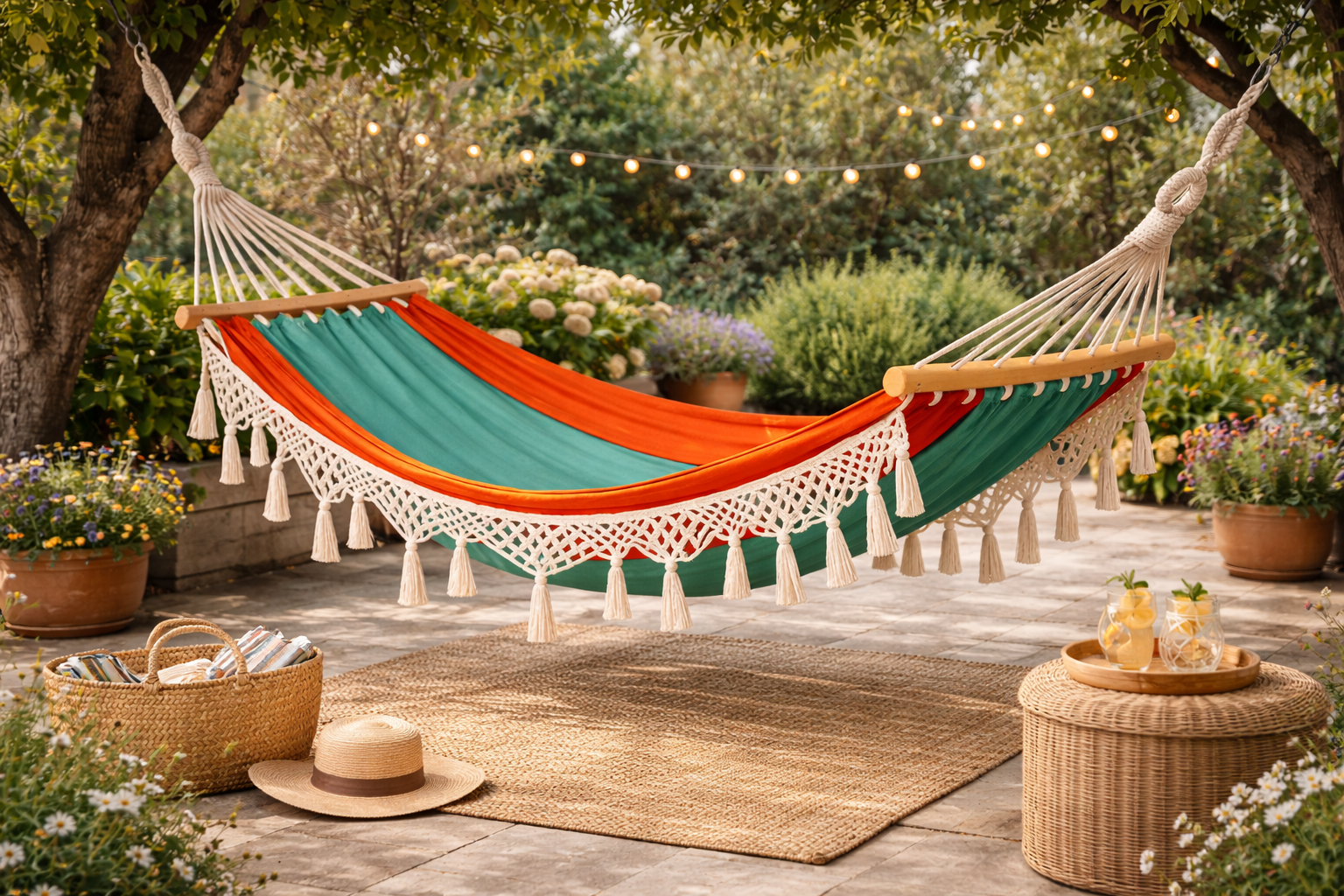 Relax outdoors with this comfortable fabric hammock, ideal for gardens, patios, and backyard spaces. Designed for everyday outdoor lounging and peaceful moments.